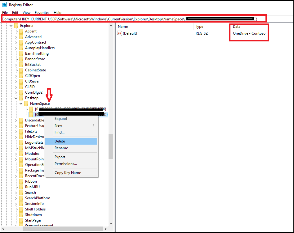 3. Find registry with name “onedrive – company” in “data” column, delete the registry by right click on it. (there might be 2 registry with same name. you may need to try which one is related to the unwanted folder)